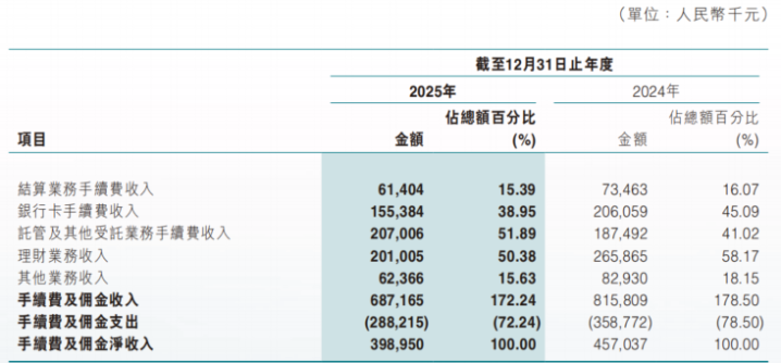 分业务看,2025年,该行利息净收入88.27亿元,同比下落3.78%,主要原因是利息收入减少额高于利息开销减少额;全年净息差为1.25%,同比下落0.1个百分点。 非利息收入方面,该行旧年非利息净收入28.69亿元,较上年同期减少2.68亿元,降幅为8.55%。其中,手续费及佣金净收入3.99亿元,同比下落12.71%。东莞农商行指出,主要原因是调降答理居品费率。