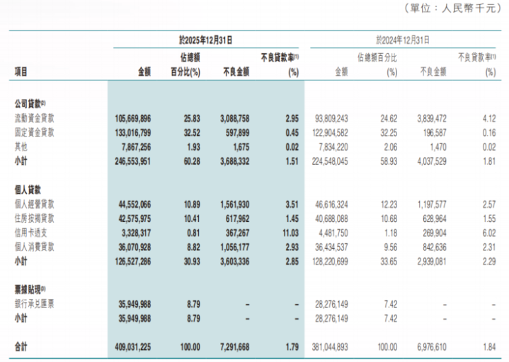 贷款方面,2025年末,该行公司贷款余额达2465.54亿元,同比增长9.8%,占总贷款60.28%;个东谈主贷款余额达1265.27亿元,同比下滑1.3%,占总贷款30.93%。 对公方面,2025年,东莞农商行发力金融“五篇大著述”与深耕原土市集。2025年末,该行科技企业贷款余额达600.47亿元,同比增速26.92%;绿色信贷余额达193.58亿元,同比增速为18.01%。此外,该行以多元化居品促进普惠金融,年末普惠型小微企业贷款余额达541.66亿元,同比增速为7.08%;鼎力支合手国度级和省级“专精特新”企业1123家,制造业及联系产业贷款余额增速为17.05%。 个东谈主贷款方面,2025年末,该行个东谈主诡计贷、住房按揭贷款、个东谈主耗尽贷年末余额辞别为445.52亿元、425.76亿元、360.71亿元,同比辞别增长-4.4%、4.64%、-1%,组成东莞农商行个东谈主贷款业务三大撑合手。 钞票质料方面,2025年末,该行不良率为1.79%,较上年末下落0.05个百分点。其中,公司贷款不良率较上年末下落0.3个百分点至1.51%;个东谈主贷款不良率则从上年末的2.29%上涨至2.85%,其中信用卡不良率最高,达11.03%。 职工东谈主均降薪近5%,董事长、行长降薪近40万元 在营收、净利润接连下落配景下,2025年,东莞农商行聘用了本钱压降步调,全年贸易用度达46.24亿元,较上年同期减少1.29亿元,降幅为2.71%,主如若职工用度减少。 2025年,该行职工用度达28.93亿元,较上年同期减少1.65亿元,降幅为5.39%。其中,年末职工数为7802东谈主,较上年末减少57东谈主。按此计较,2025年,该行职工平均年薪为37.09万元,同比下落4.7%。 另一方面,在职工降薪同期,东莞农商行董事长卢国锋、行长傅强薪酬一样出现下落。财报袒露,2025年,卢国锋、傅强税前薪酬均为184.4万元,均较上年下落38.6万元,降幅为17.3%。值得稳妥的是,傅强自2019年7月起担任东莞农商行行长,于今已跨越6年,行将波及银行业金融机构高管原则上轮岗不跨越7年的监管线,对于傅强接下来的轮岗安排也成为市集缓和焦点。